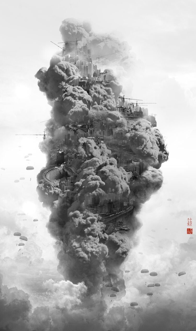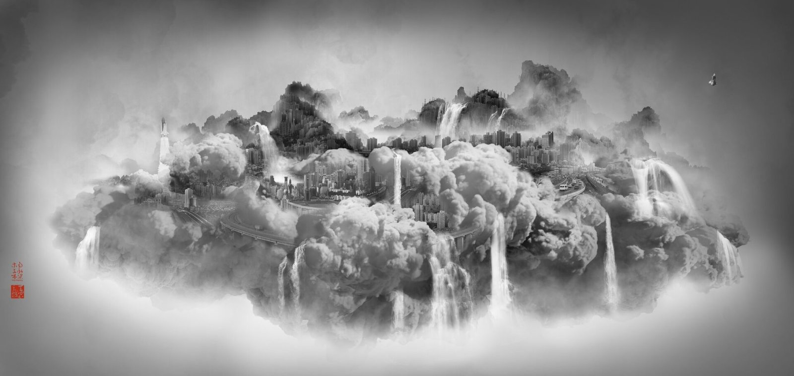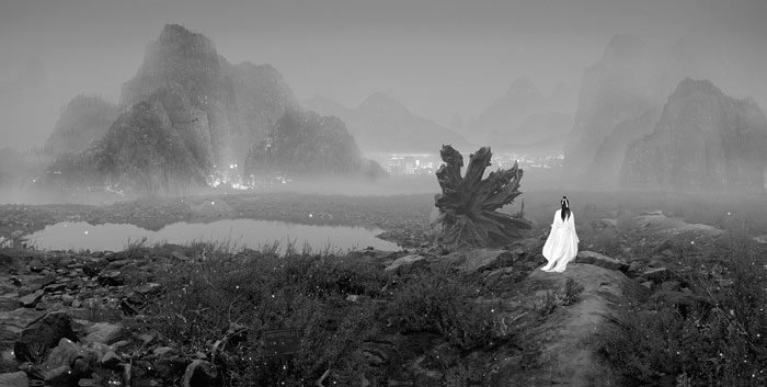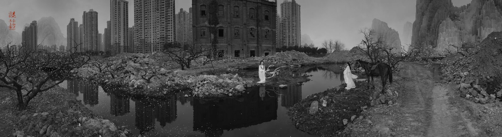 Yongliang is among a generation of young artists who came of age after the Chinese Cultural Revolution, and therefore embraces a level of artistic freedom that is not common among past generations of Chinese artists. Yang Yongliang combines ancient Chinese art techniques, such as shui mo painting and calligraphy, with photographic elements of modern urban Shanghai, arranged in the traditional composition of Chinese landscape, to produce artworks with a perfect balance between fragility and danger, beauty and cruelty.