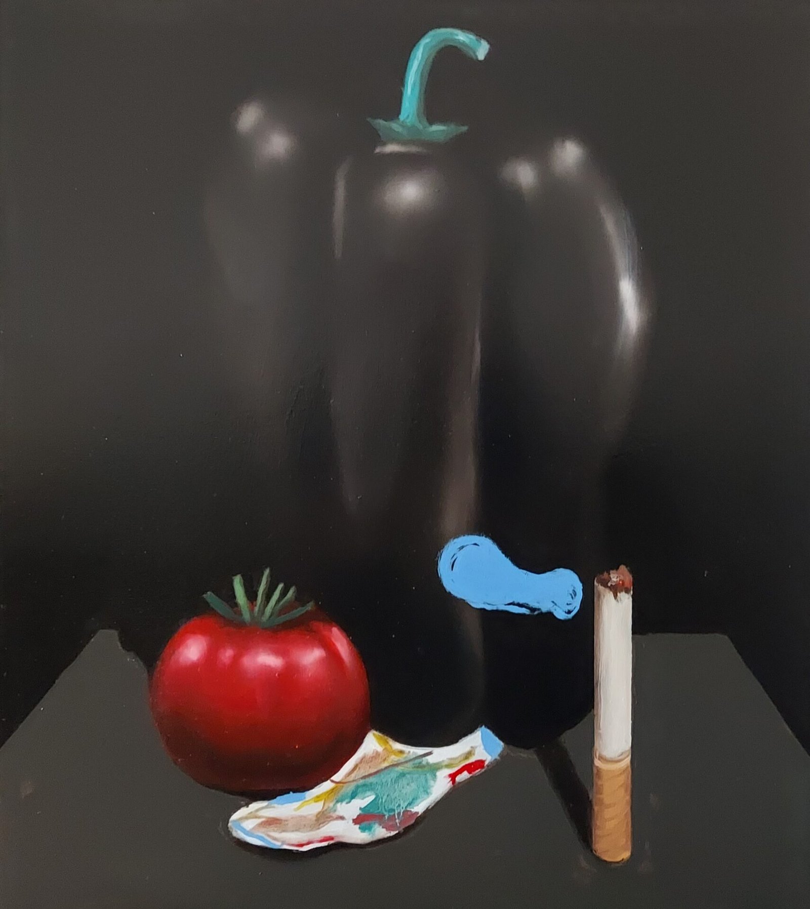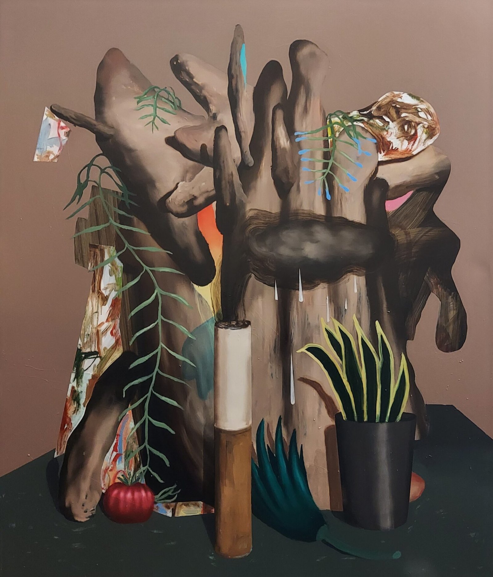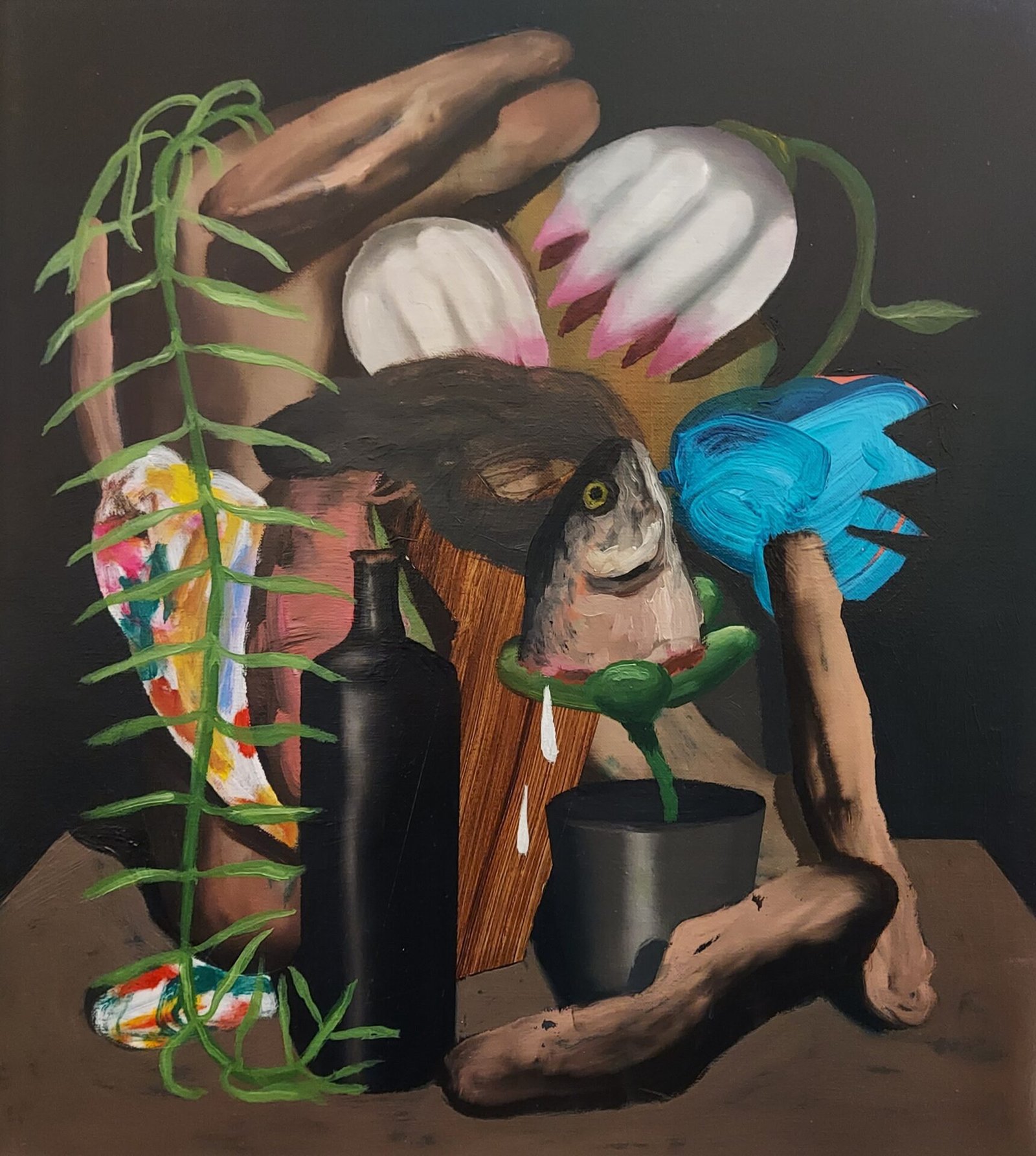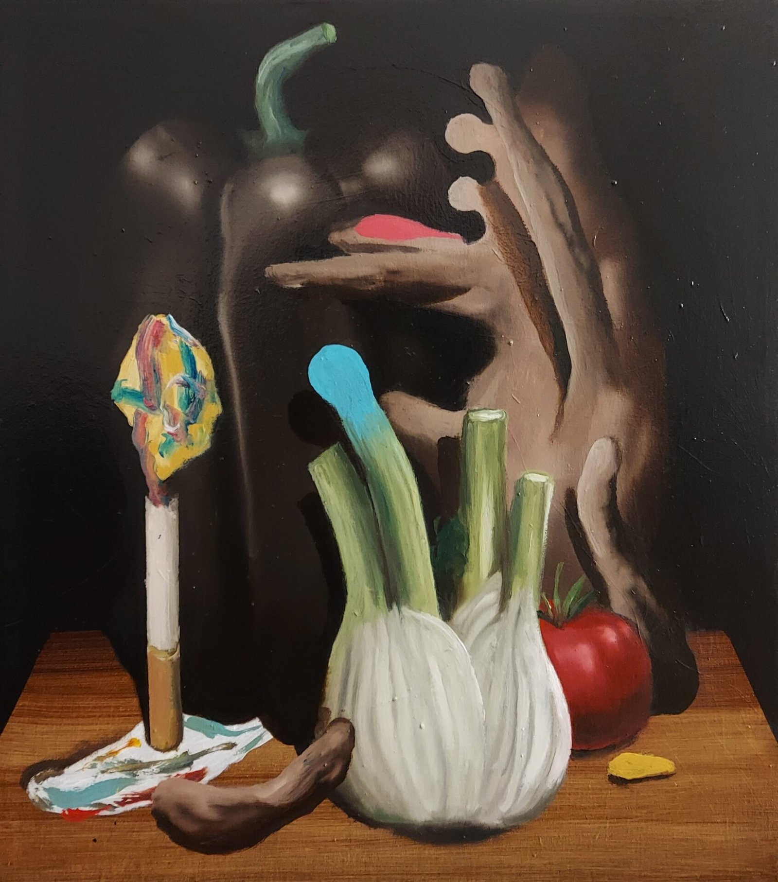 Sale constructs a visionary universe that evokes the dense and primordial atmospheres of Henri Rousseau, yet contaminates them with a contemporary psychological tension. There is no distinction between the curve of a muscle and the pulp of a vegetable: everything is turgid, alive, almost tactile. The figurations merge into a voyeuristic play where nature is no longer decoration, but a pulsating and desiring organism.