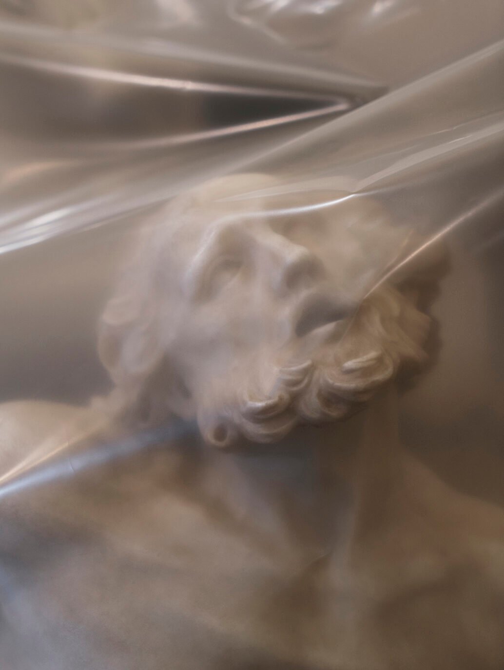 The ancient mythology represented in the sculptures clashes with the sterility of plastic, creating a fascinating and alienating contrast. Plastic, a symbol of contemporaneity and human fragility, overlaps with timeless works of art, highlighting their condition of isolation.