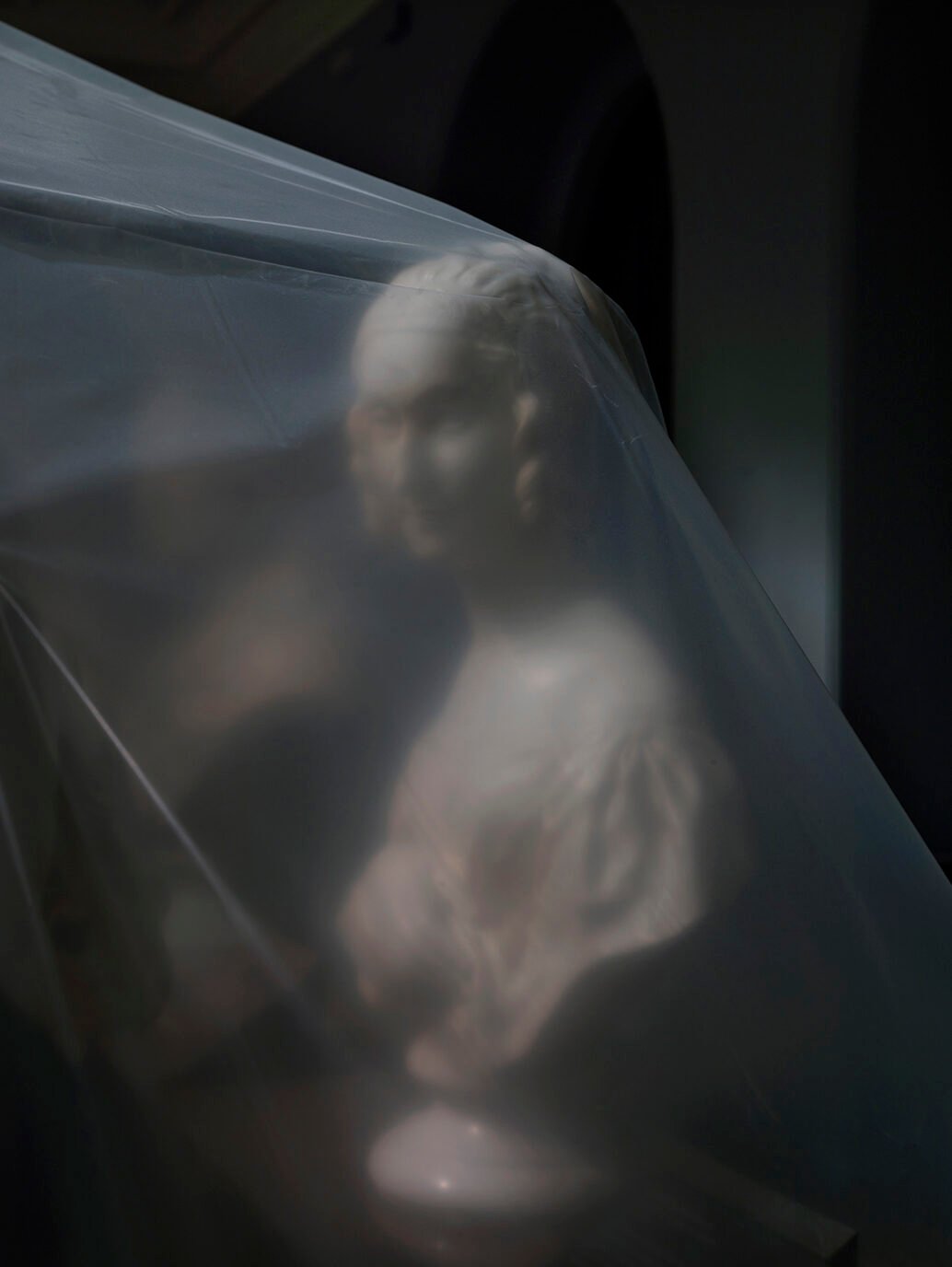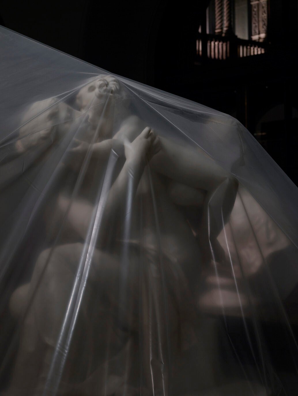 In this exhibition, Roberts abandons his usual style of landscape photography to focus on more intimate work. The 12 shots on display portray the marble sculptures of the Victoria and Albert Museum, illuminated only by night light, protected by plastic sheets during the renovation works and closed to the public due to the pandemic.