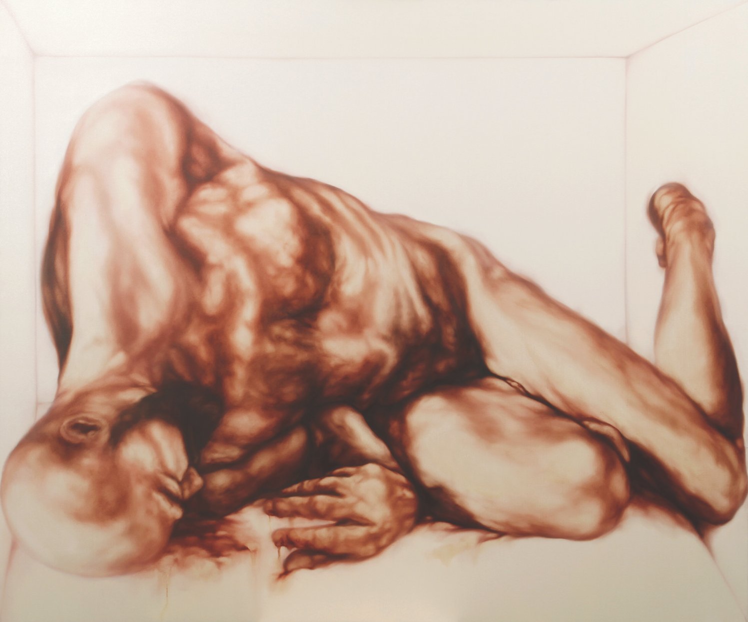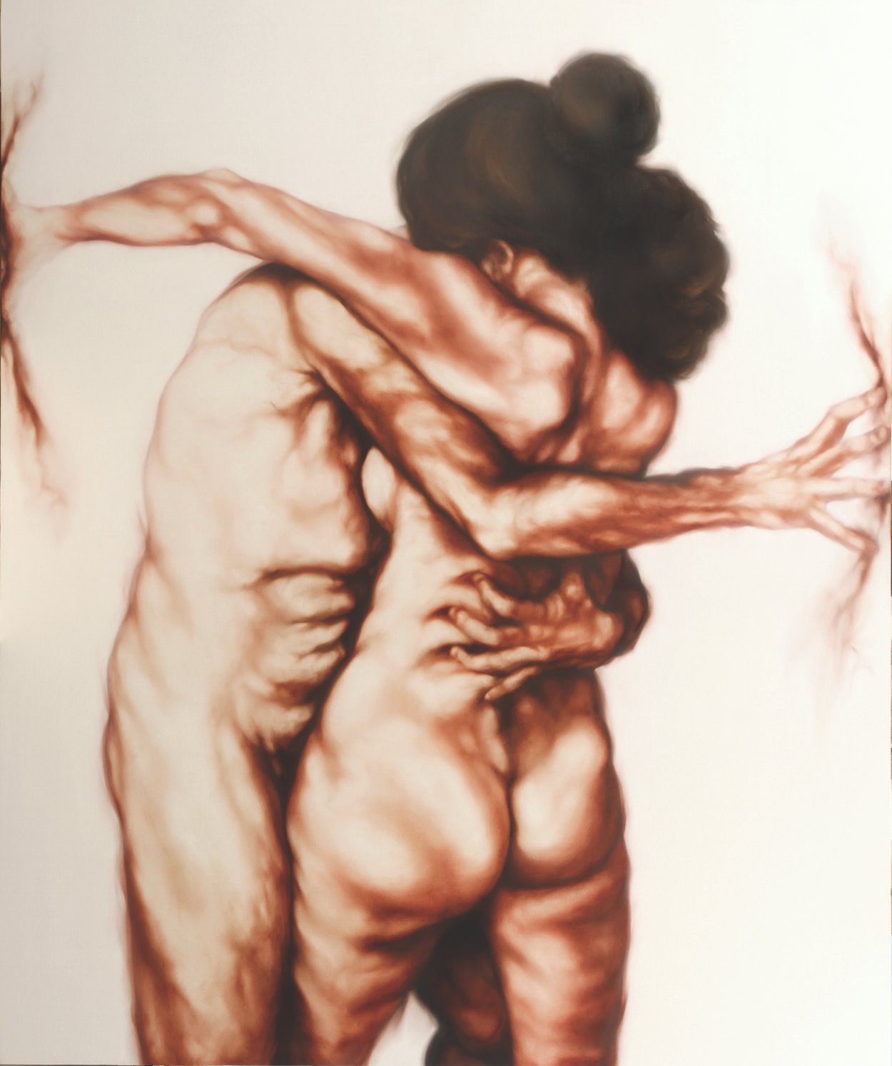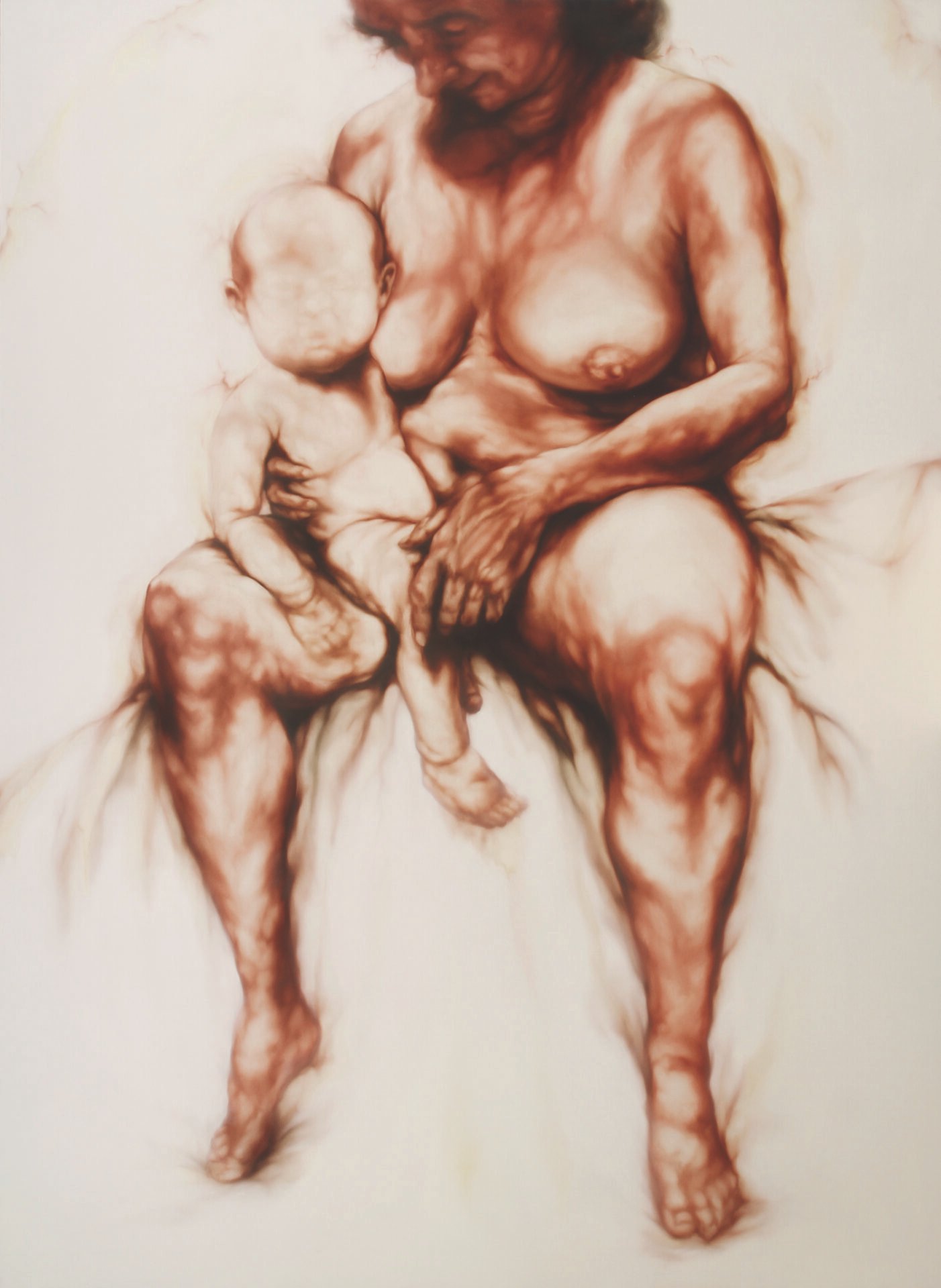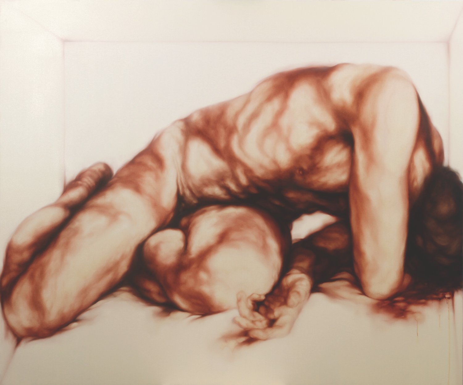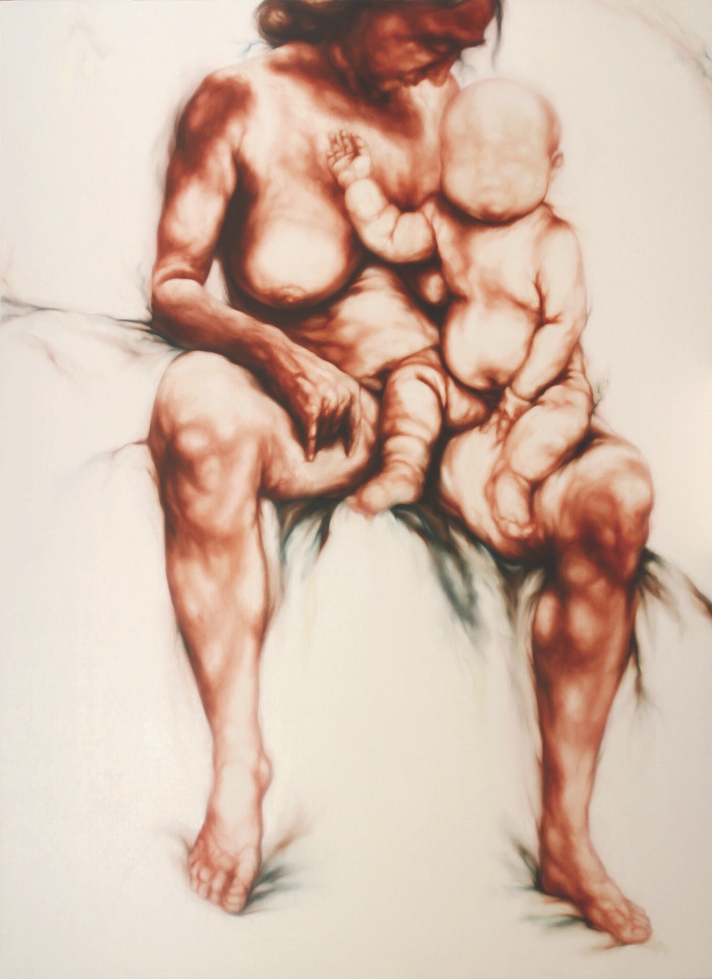 In art, the iconography of the Madonna with child, the loving mother par excellence, dates back to the Byzantine world. Bellucco is inspired by this iconographic model in painting these great Majesties, but bearers of a sick relationship in which motherhood becomes a source of discomfort. These mothers hold their babies on their knees who seem to push themselves in every way away from their mothers’ wombs, in search of that living space which will be the natural cutting of the (ideal) cord that will make them Men in the World. Alessandro Bellucco uses motherhood as a carcinogenic symbol of degeneration that is transmitted as educational DNA, often the origin of much psychological and character damage. The families they belong to are a melting pot of relationships, affections, small hatreds and indissoluble loves, often unsolvable in their unique relationship or non-communication. You don’t choose your family, they say. Alessandro Bellucco draws attention to the false myth of motherhood as unconditional love, which, instead, very often conceals complex emotional-psychological relationships. Let’s think about Greek literature, which gave us figures such as Oedipus or Medea, in which the relationship between mothers and children turns into tragedy and atrocious revenge. All the more atrocious if the one who carries out the murder is a mother, blood of our blood and true parent (i.e. the one she generates). This negative relationship also finds form in the two canvases that Alessandro Bellucco accompanies the two large Mothers/Majesties: two male figures on the ground, closed in a very narrow and narrow place (sick relationships?). Fallen heroes, similar but different, like brothers, who seem to have returned from a clash… they look like two Greek warriors who clashed in battle… the battle, perhaps, of their own affirmation, having become adults (but not Men) in front of Mothers/matrons. The same ones who hold children on their knees who are unaware, but somehow aware, of their Destiny from which they try, through their movements, to escape. An effort made even more evident by the (wise) use of subtraction painting that Bellucco uses to suggest, through the use of the white canvas, the weight of the bodies, where they are not even drawn. We also have examples of these difficult mother-child relationships in modern medical literature: think of the “Munchausen syndrome by proxy”: medical texts define this syndrome as “…a “fictitious” disorder in which the symptoms are created by the mother’s mind – often – to obtain attention and consideration from others; the “by proxy” form concerns secretly committing harmful acts on the child in order to then be able to look after and care for him, acquiring the prestigious role of the child’s savior… Psychologically the maternal bond is a very strong ambivalent bond in the two extreme polarities: one mother can love and take care of the child or she can hate him to the point of killing him…”.