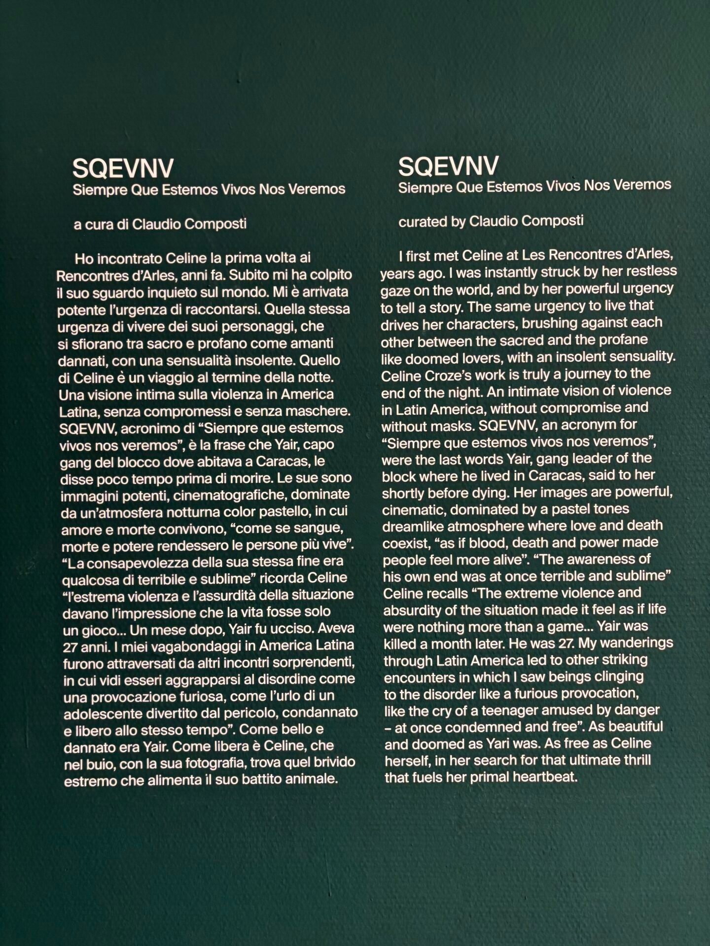 Claudio Composti: I met Celine for the first time at the Rencontres d’Arles, years ago. I was immediately struck by her restless gaze on the world. I was struck by the powerful urge to tell her story. That same urgency of life of her characters, who touch each other between the sacred and the profane like damned lovers, with an insolent sensuality. Celine’s is a journey to the end of the night. An intimate vision of violence in Latin America, without compromises and without masks. SQEVNV, an acronym for “Siempre Que Estemos Vivos Nos Veremos”, is the phrase that Yari, the gang leader of the block where she lived in Caracas, told her shortly before dying.