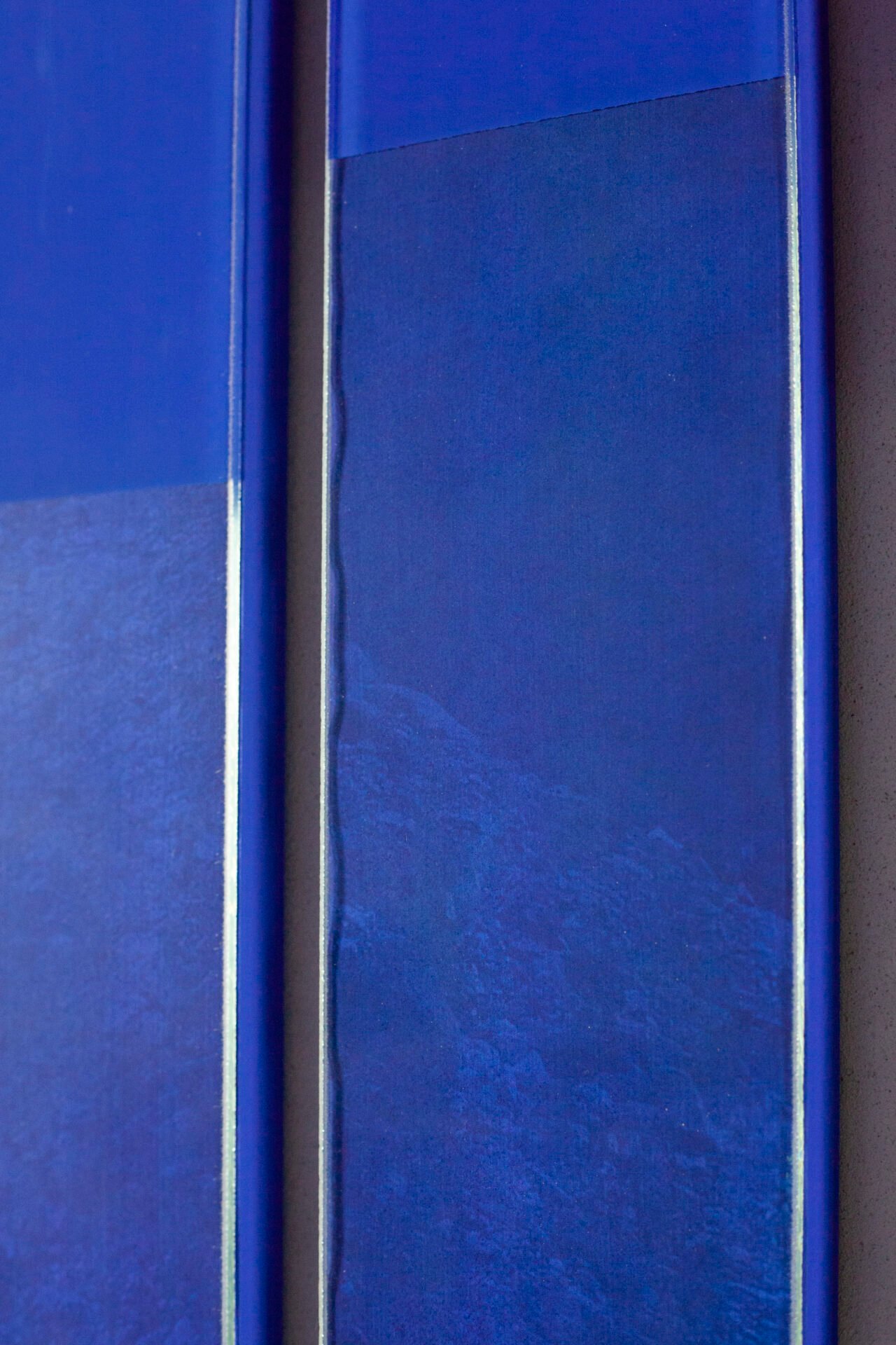 2025, Glass painted with acrylic, cyanotype, and acrylic on bamboo paper, aluminum, wood